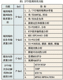 中創信測公司提供的IPTV監測系統(如表1所示),提供高速數據捕獲和在線分析,系統支持GE/2.5G/10G高速率接口;支持承載網絡性能分析和IPTV業務質量分析;支持主動和被動分析模式,全面提供性能測試手段以及全方位的QoS監測分析。