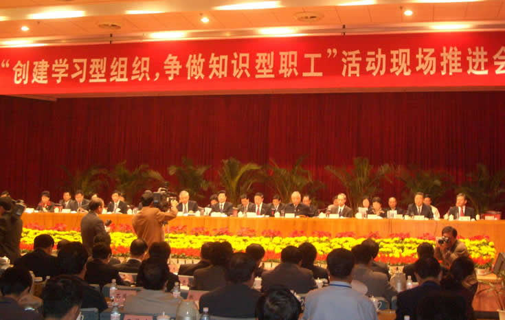 2004年10月17日由中華全國總工會、中央文明辦、國家發(fā)展和改革委員會、教育部、科技部、人事部、勞動和社會保障部、國務院國有資產(chǎn)監(jiān)督管理委員會、全國工商聯(lián)等九部委共同召開的全國“創(chuàng)建學習型組織、爭做知識型職工”活動(簡稱“創(chuàng)爭”活動)現(xiàn)場推進會今天上午在山東省青島市召開。中共中央政治局委員、全國人大常委會副委員長、中華全國總工會主席王兆國出席會議并講話。