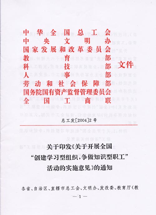 關(guān)于印發(fā)《關(guān)于開(kāi)展全國(guó)“創(chuàng)建學(xué)習(xí)型組織,爭(zhēng)做知識(shí)型職工”活動(dòng)的實(shí)施意見(jiàn)》的通知
