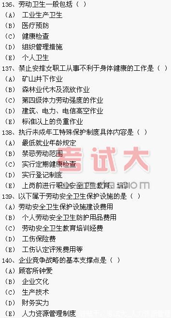 多項選擇題 124、薪酬市場調查常用的方式有( ) (A) 企業之間相互調查 (B) 委托調查 (C) 直接調查 (D) 公開調查的信息 (E) 調查問卷 125、傳統的薪酬結構類型有( ) (A) 以績效為導向的薪酬結構 (B) 以工作為導向的薪酬結構 (C) 以能力向導向的薪酬結構 (D) 組合薪酬結構 (E) 以結果為向的薪酬結構 126、薪酬制度的設計要點有( ) (A) 薪酬水平與薪酬結構設計 (B) 薪酬等級設計 (C) 固定薪酬設計 (D) 浮動薪酬設計 (E) 過渡辦法設計 127、以下條款屬于勞動合同內容的是( ) (A) 勞動合同期限 (B) 工作內容 (C) 勞動報酬 (D) 社會保險 (E) 勞動紀律 128、對勞動者不得解除勞動合同的條件是( ) (A) 患職業病者 (B) 患病或者負傷在規定醫療期內的 (C) 部分喪失勞動能力的 (D) 女職工在孕、產、哺乳期內的 (E) 法律、法規規定的其他情形 129、集體合同內容一般包括( ) (A) 勞動條件標準部分 (B) 一般性規定 (C) 勞動保障部分 (D) 過渡性規定 (E) 其他規定 130、訂立集體合同應遵循的原則是( ) (A) 只維護集體的利益 (B) 內容合法 (C) 平等合作、協商一致 (D) 兼顧所有者,經營者、勞動者利益 (E) 維護正常的生產工作秩序 131、勞動爭議處理的原則是( ) (A) 著重調解及時處理 (B) 在查清事實的基礎上依法處理 (C) 當事人在適用法律上一律平等 (D) 強制性 (E) 維護當事人的利益 133、勞動爭議仲裁的原則有( ) (A) 一次裁決原則 (B) 合議原則 (C) 強制原則 (D) 回避原則 (E) 區分舉證責任原則 134、勞動爭議的預防措施有( ) (A) 強化勞動關系當事人的勞動法則觀念 (B) 強化對勞動法律、法規執行情況監督檢查 (C) 強化勞動合同、集體合同的管理 (D) 強化和完美企業的民主管理體制 (E) 完美我國的勞動立法 135、當員工受到挫折后和員工溝通的方法是( ) (A)勸告 (B)按撫、勸慰 (C)鼓勵、溝通 (D)冷漠 (E)重新定向