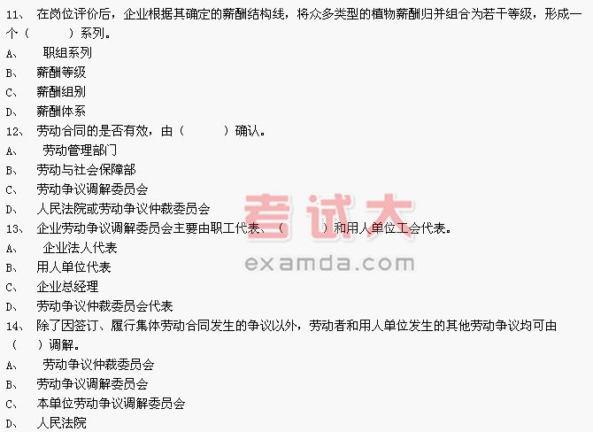 15、 當(dāng)發(fā)生爭議的企業(yè)與職工不在同一仲裁委員會轄區(qū)的,由職工當(dāng)事人( )所在地仲裁委員會受理。 A、 檔案關(guān)系 B、 勞動合同關(guān)系 C、 戶口關(guān)系 D、 工資關(guān)系 16、 經(jīng)濟(jì)運(yùn)行主體,可以分為( )三個層面。 A、 個人、企業(yè)、社會 B、 個人、企業(yè)、國家 C、 個人、企業(yè)、經(jīng)濟(jì) D、 個人、社會、國家 17、 中觀勞動力供給,是( )的勞動力供給,是社會勞動總供給的下一個層次,是對于某一產(chǎn)業(yè)、部門供給的偏好。 A、 產(chǎn)業(yè)、行業(yè) B、 產(chǎn)業(yè)、部門 C、 區(qū)域經(jīng)濟(jì) D、 社會經(jīng)濟(jì) 18、 社會勞動需求不充分,但仍將勞動力硬性吸收進(jìn)入工作單位爾就業(yè),形成勞動力在崗位上工作人物小的狀態(tài),經(jīng)濟(jì)上稱之為( ): A、 潛在性失業(yè) B、 隱蔽性失業(yè) C、 不充分就業(yè) D、 停滯性失業(yè) 19、 勞動力供給與需求在結(jié)合過程中偶然十條所造成的暫時失業(yè),我們稱之為( )。 A、 總量性失業(yè) B、 結(jié)構(gòu)性失業(yè) C、 選擇性失業(yè) D、 摩擦性失業(yè) 20、 中等口徑的勞動力市場,是指勞動要素交換場所與勞動要素( )兩者之和。 A、 流動趨勢 B、 勞動要素配置關(guān)系 C、 交換關(guān)系 D、 市場配置關(guān)系 21、 就業(yè)服務(wù),市政府專職勞動管理部門對于求職人員提供各項(xiàng)幫助和服務(wù)工作的總和,是就業(yè)體制( )的產(chǎn)物。 A、 市場化 B、 與經(jīng)濟(jì)發(fā)展相結(jié)合 C、 規(guī)范化 D、 標(biāo)準(zhǔn)化 22、 雇主最后雇用的那個工人所增加的產(chǎn)量,等于付給該工人的工資,如果增加的產(chǎn)量小于付給他的工資,雇主就不會雇用他;相反就會雇傭更多的工人,我們把這種現(xiàn)象叫做( )。 A、 彈性生產(chǎn)力概念 B、 邊際生產(chǎn)力概念 C、 彈性勞動關(guān)系 D、 邊際勞動關(guān)系 23、 狹義的( ),是宏觀經(jīng)濟(jì)調(diào)控的手段,用于控制貨幣工資與物價的增長,達(dá)到宏觀經(jīng)濟(jì)的穩(wěn)定,這是與與財政政策、貨幣政策并列的三大政策之一。 A、 工資政策 B、 收入政策 C、 工資保護(hù)政策 D、 工資導(dǎo)向政策 24、 勞動監(jiān)督檢查時值( )以上各級人民政府勞動行政部門依法對用人單位遵守勞動法律法規(guī)的情況進(jìn)行監(jiān)督檢查,對違反勞動法律、法規(guī)的行為有權(quán)制止,并責(zé)令改正。 A、 縣級 B、 地區(qū)級 C、 市級 D、 省級 25、 在經(jīng)濟(jì)統(tǒng)計中,預(yù)值控制就是對于需要錄入的一些編碼和指標(biāo)數(shù)據(jù),事先規(guī)定一定的控制范圍值,并編入程序,當(dāng)錄入的數(shù)據(jù)( )時,計算機(jī)將拒絕接受。 A、 不全面 B、 不準(zhǔn)確 C、 超出范圍 D、 邏輯錯誤 以上1-25題,為基礎(chǔ)知識部分,來自《基礎(chǔ)知識》教材 26、 ( )是指一名上級領(lǐng)導(dǎo)直接領(lǐng)導(dǎo)下級的人數(shù),它與( )相互聯(lián)系,相互制約。 A、 管理寬度、管理跨度 B、 管理幅度、管理層次 C、 管理層次、管理幅度 D、 管理幅度、管理寬度 27、 廣義的人力資源規(guī)劃事情所有類型人力資源計劃的總稱,從規(guī)劃的期限上看,( )年以上的為長期規(guī)劃,一年以內(nèi)的為短期計劃,介于兩者之間的是中期規(guī)劃。 A、2 B、3 C、4 D、5 28、 狹義的人力資源規(guī)劃,是指企業(yè)從戰(zhàn)略規(guī)劃和發(fā)展目標(biāo)出發(fā),根據(jù)期內(nèi)外部環(huán)境的變化,預(yù)測企業(yè)未來對人力資源的需求,以及滿足這種需求所提供的人力資源的活動過程,也可以叫做( )的制定。 A、 企業(yè)人員計劃 B、 人力資源發(fā)展計劃 C、 人力資源開發(fā)計劃 D、 人力資源管理計劃 29、 當(dāng)企業(yè)下一年度工資調(diào)整的意向小于當(dāng)?shù)刈畹凸べY標(biāo)準(zhǔn)與消費(fèi)者物價指數(shù)兩者增長幅度的最高比例時,應(yīng)建議企業(yè)適當(dāng)( )調(diào)整幅度,以求正確地解決現(xiàn)存問題,切實(shí)保證企業(yè)合法經(jīng)營。 A、 降低 B、 提高 C、 持平 D、 根據(jù)企業(yè)經(jīng)營現(xiàn)狀進(jìn)行 以上26-29題共四分,為人力資源規(guī)劃內(nèi)容 30、 “應(yīng)聘人員的年齡不超過35歲”這樣的招聘用語違反了招聘原則中的( )。 A、 確保質(zhì)量原則 B、 公平公正原則 C、 雙向選擇原則 D、 效率優(yōu)先原則 41、 績效管理是一個外延比較寬泛的概念,它是指從績效計劃、到考核標(biāo)準(zhǔn)的制定、從具體考核、評價的具體實(shí)施,乃至信息反饋、總結(jié)和改進(jìn)工作等全部活動的過程。其中績效計劃的意思為( )。 A、 績效溝通 B、 績效目標(biāo)的制定 C、 持續(xù)的績效溝通 D、 績效評價標(biāo)準(zhǔn) 42、 績效考評一般包括業(yè)績考評、能力考評和( )。 A、 工作態(tài)度考評 B、 責(zé)任感考評 C、 開拓性考評 D、 工作熱情考評 43、 以員工行為為對象進(jìn)行考評的辦法包括關(guān)鍵事件法、行為觀察量表法、行為定點(diǎn)量表法、排隊(duì)法、( )等。 A、 書面法 B、 混合標(biāo)準(zhǔn)尺度法 C、 硬性分配法 D、 生產(chǎn)能力衡量法 44、 在對員工進(jìn)行能力考評時,一般分為基本能力和( )兩個部分。 A、 業(yè)務(wù)性能力 B、 經(jīng)驗(yàn)