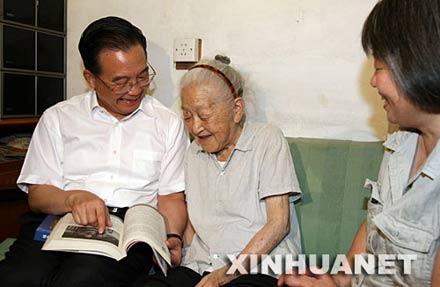8月3日,中共中央政治局常委、國務院總理溫家寶來到位于中關村的何澤慧家,看望這位93歲的核物理學家。何澤慧院士是“中國原子彈之父”錢三強的夫人,曾經和錢三強一起發現了鈾核三分裂、四分裂現象,被譽為“中國的居里夫婦”。 新華社記者 黃敬文攝