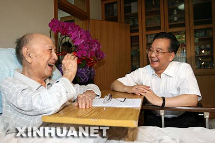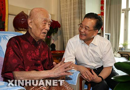 8月3日,中共中央政治局常委、國務院總理溫家寶來到著名物理學家朱光亞家,看望這位曾經在我國原子彈、氫彈研制中有過突出貢獻的“兩彈一星”功勛獎章獲得者。 新華社記者 黃敬文攝