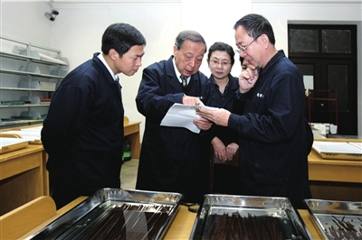 專家們在探討工作,他們面前的托盤中擺放的就是戰國竹簡。郭海軍 攝
