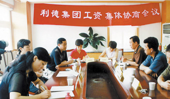 圖為天津市利德集團工資集體協商會議現場。(全總集體合同部提供)  工資集體協商機制是協調勞資關系、促進各方共贏的關鍵環節,也是構建和諧社會不可缺少的因素。如何使其盡早覆蓋所有企業是我們面臨的新課題——