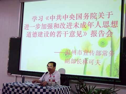 2004年6月9日下午學(xué)校黨總支邀請(qǐng)溫州市委宣傳部常務(wù)副部長林可夫同志來我校繡山校區(qū)作了學(xué)習(xí)《中共中央國務(wù)院關(guān)于進(jìn)一步加強(qiáng)和改進(jìn)未成年人思想道德建設(shè)的若干意見》的報(bào)告,全體教職工出席了報(bào)告會(huì)。
